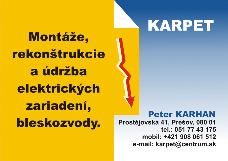 | Meno firmy: | Peter Karhan-KARPET | | Mesto: | Preov | | Ulica/č.: | Prostejovska 41 | | PSČ: | 08001 | | IČO: | 30288819 | | Telefón: | +421908061512 | | Telefón 2: | 0517743175 | | Fax: | | | Web: | www. | | Email: | karpet@centrum.sk |