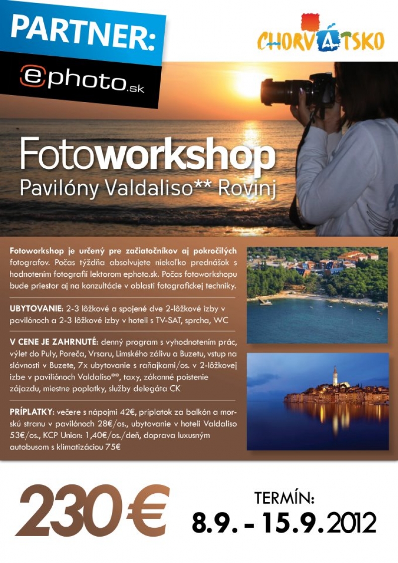 Fotoworkshop 6.9.-15.9.2013 ubytovanie: rezort Valdaliso** Rovinj Fotoworkshop je ur?en pre za?iato?nkov aj pokro?ilch fotografov. Po?as td?a absolvujete nieko?ko prednok s hodnotenm fotografi lektorom ephoto.sk. Po?as fotoworkshopu bude priestor aj na konzultcie v oblasti fotografickej techniky. Ubytovanie: 2-3 lkov a spojen dve 2-lkov izby v pavilnoch a 2-3 lkov izby v hoteli s TV-SAT, sprcha, WC Cena s kurzom, ubytovanim, transfermi a polpenziou: od 219