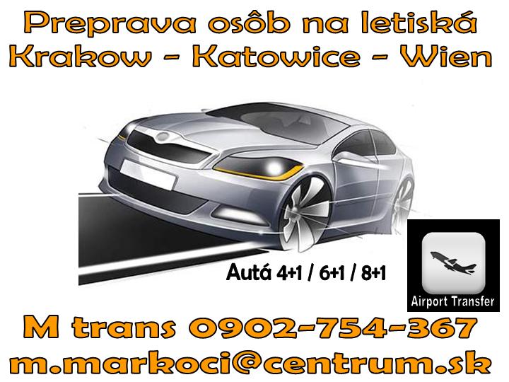 Preprava na letiska Krakow Cracow Balice, Katowice Pryzowice, Warszawa Warsaw Chopin Airport, Wien Schwechat,Budapest Ferihegy - Listz Ferenc... Polsko Slovensko preprava osob / airport transfer denne z a do miest Kosice, Presov, Poprad, Bardejov, Stara Lubovna, Humenne, Michalovce a ine. Spolahliv preprava osob na letisko pre Vs - oficialna firma s povolenim na podnikanie v doprave - koncesia Taxi - kazdy sofer ma kartu vodica a psychotesty - poistenie osob a batoziny - GPS a vyzvihnutie priamo na Vasej adrese http://www.prepravaletisko-krakow.com/